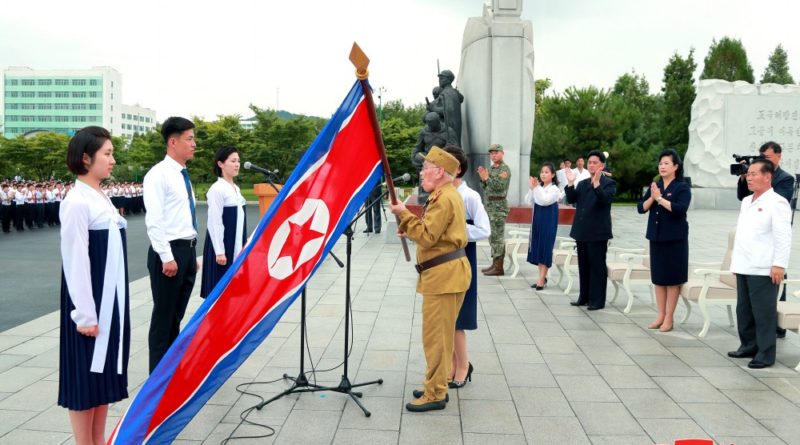 Ao som da música “Festa da grande vitória na guerra”, o veterano de guerra Kim Yong Hwang entregou aos jovens da nova geração a bandeira nacional que brilha como símbolo de heroísmo e vitória da Coreia do Juche.